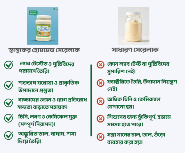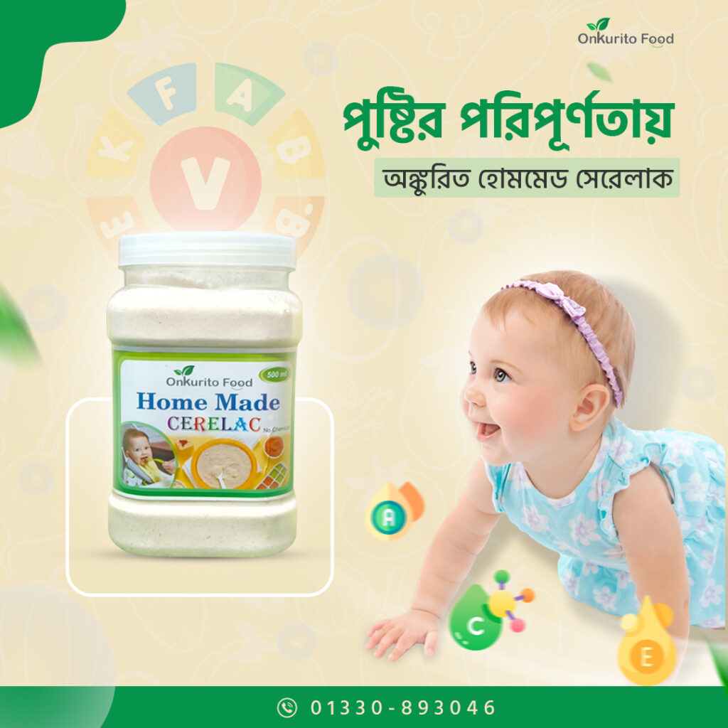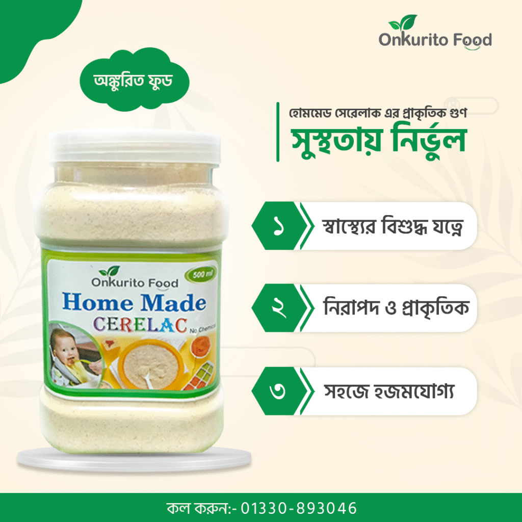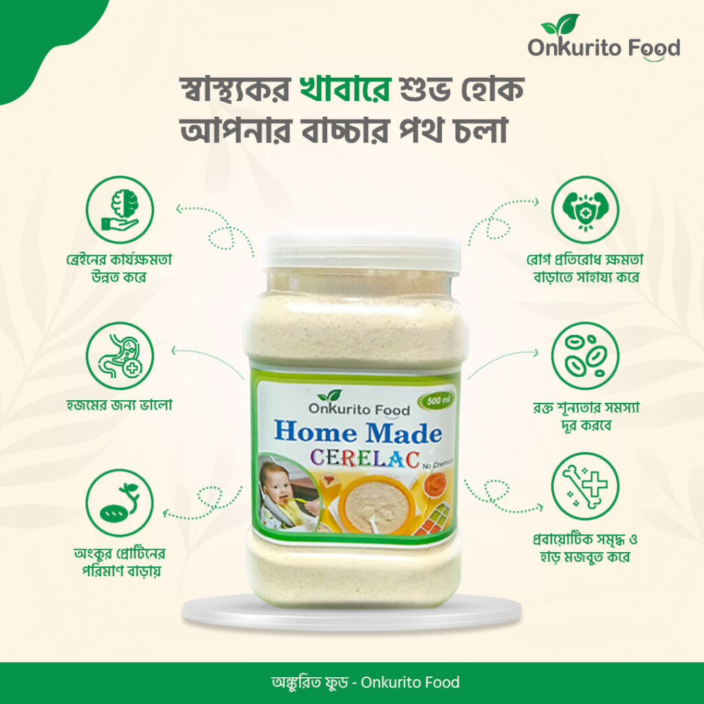 আমেরিকার শিশু বিশেষজ্ঞদের মতে, যেসব শিশুর ওজন কম হয় এবং কোনভাবেই ওজন বাড়ছে না, সে ক্ষেত্রে হোমমেড সেরেলাক ওজন বৃদ্ধিতে এবং শিশুর মেধা বিকাশে বেশ সহায়তা করে। যখন শিশুর বয়স ছয় মাসে পৌঁছায়, তখনই শুধুমাত্র মায়ের দুধ নয় — তার পাশাপাশি পুষ্টিকর সম্পূরক খাবার খাওয়ানো উচিত। আর আমাদের অঙ্কুরিত হোমমেড সেরেলাকে রয়েছে আয়রন, ক্যালসিয়াম, ভিটামিন এ, ওমেগা ৩ এবং ওমেগা ৬; এছাড়াও রয়েছে ২১টি প্রাকৃতিক পুষ্টিগুণসম্পন্ন উপাদান। আপনার বাচ্চা পাবে প্রতি চামচে ২১টি পুষ্টির গুণাগুণ এবং সঠিক পুষ্টি, যা শরীরের ওজন বৃদ্ধির পাশাপাশি মস্তিষ্কের গঠন ও রোগ প্রতিরোধ ক্ষমতা বৃদ্ধিতে সহায়তা করবে।